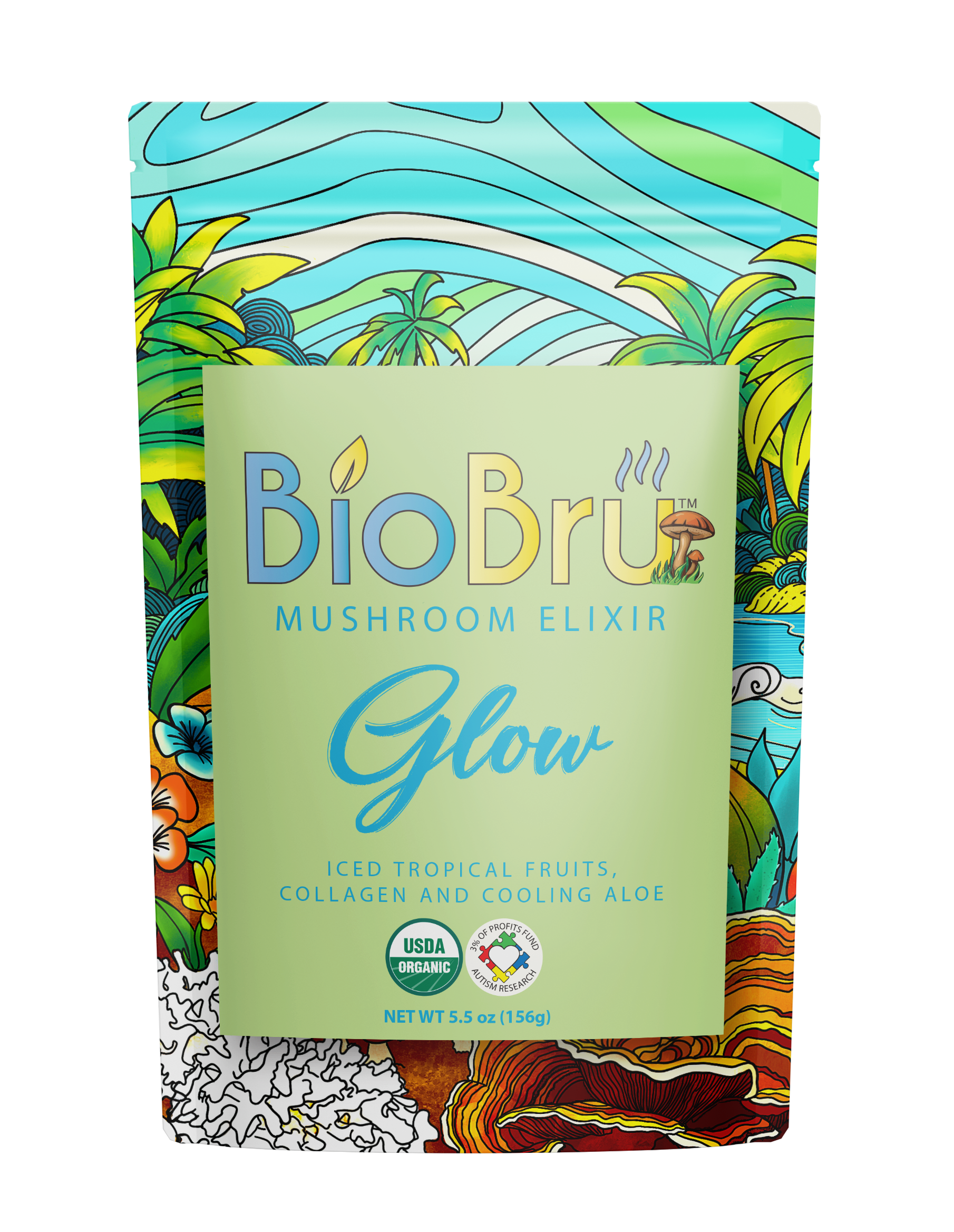 Citrusy, bright, and uplifting—Glow brings together golden roots, sunny botanicals, and mushrooms that support immunity, inflammation, and radiance from within.